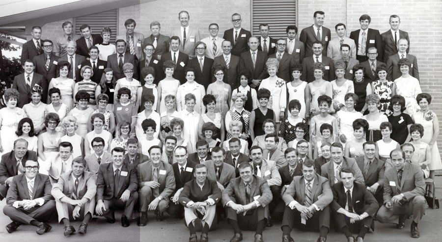 Top Row: Sam Irwin, Tom Main, Dean Brougham, Mary Vogt, Mike Dinovo, Larry Beltz, Floyd Diamond, Ron Smith, Bill Dimmitt, Larry Olson, Tito DeSantiago, Larry Wheeler, Larry Ives, Jim Evans, Melvin Carmichael.